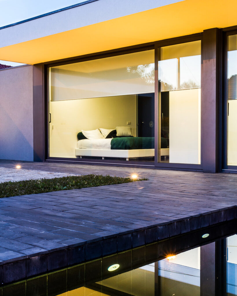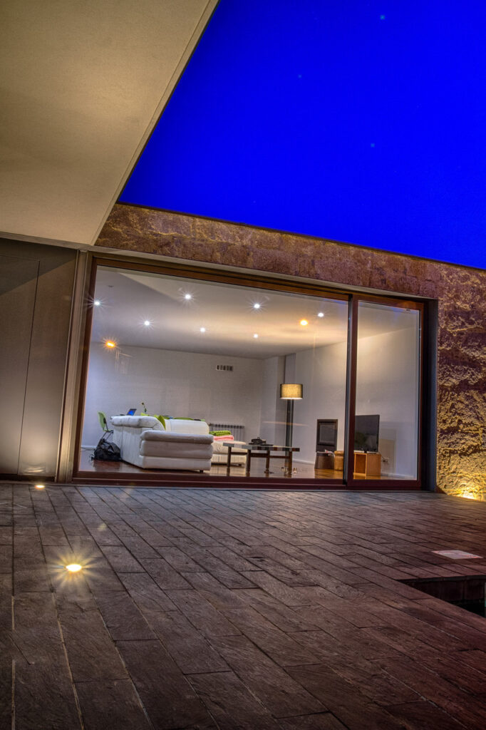 Em relação aos pavimentos exteriores, estes serão realizados em; nas zonas de acesso pedonal e automóvel, cubo de granito AZUL 10x10x10cm, amaciado; zonas de pátio deck de madeira de IPÊ; nas zonas de jardim, relva do tipo graminha.