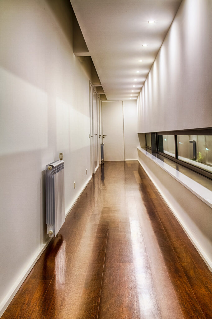 No que se refere a pavimentos interiores; quartos, suite, vestíbulos, circulações e sala comum será utilizado soalho de madeira maciça de SUCUPIRA, nas zonas de água, serão utilizados materiais cerâmicos vidrados, na garagem o pavimento será a prolongação do exterior realizado em cubo de granito 10x10x10cm amaciado.
